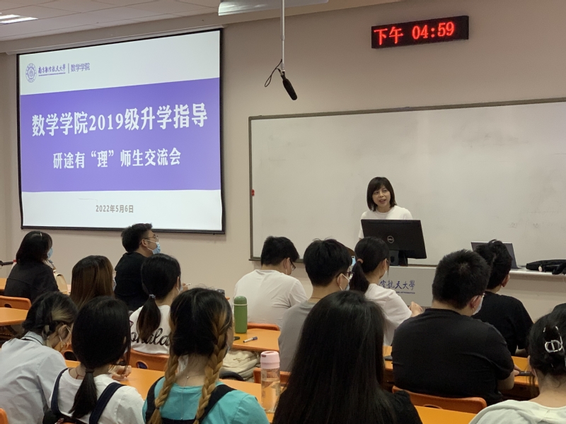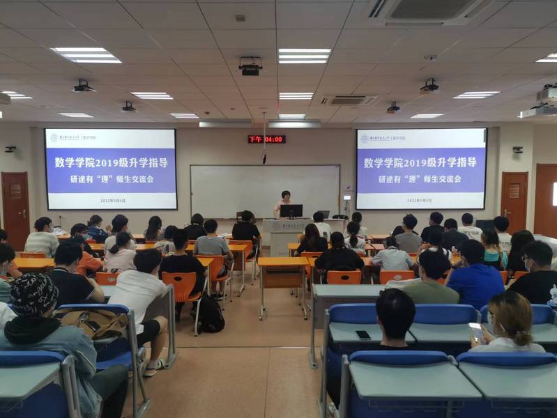 各专业情况和毕业生升学、就业前景。针对保研和考研学生,在学习成绩、科创项目等方面给出了意见建议。蒋辉告诉学生数学是一门发展前景广阔且充满活力的学科,就业前景广泛。王正盛提醒学生要对自己的个体情况要有理智、科学的认识,同时以十足的努力付出备考。