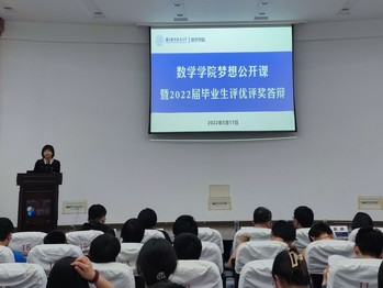 5月17日,数学21点竞技游戏 2022届本科毕业生大学成就奖、优秀毕业生院内答辩在理学楼一楼报告厅举行。21点竞技游戏 党委副书记周佼佼,教师代表王正盛、龚荣芳、赵颖以及各年级辅导员参加了此次评审,2021、2020级全体本科生到场观摩学习。