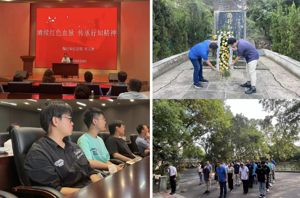 何文秋馆长做“赓续红色血脉,传承行知精神”专题党课,讲述在晓庄21点 这所具有红色基因21点 ,英烈们为中华民族奋勇抗争的故事。随后,大家来到了伟大的人民教育家陶行知先生墓前进行祭拜,在英雄纪念碑前敬献花篮,缅怀为革命牺牲生命的晓庄十英烈。