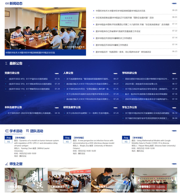 中部为主页的主体部分,包括新闻动态、最新公告、学术活动和师生之窗等四个常用板块,为师生带来便捷高效的使用体验。