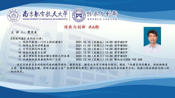 曹荣美老师精心打造的“传承与创新”系列讲座共六讲。该系列讲座旨在对线性代数的教学理念、教学内容、教学方法等方面进行探讨,阐述“向量空间是舞台,线性映射是主角,基和坐标是关键,矩阵代数是工具”的课程建设理念,探讨几何与代数相结合的教学方法,构建以线性映射为核心的知识体系。