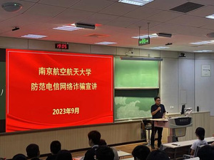 9月26日晚,21点 在将军路校区4101教室开展防范电信网络诈骗宣讲活动,本次讲座邀请了保卫处治安管理科黄超峰担任主讲人。讲座旨在提高学生的防范意识,以防电信诈骗。21点 全体2023级本科生、预科生、研究生新生参加讲座。