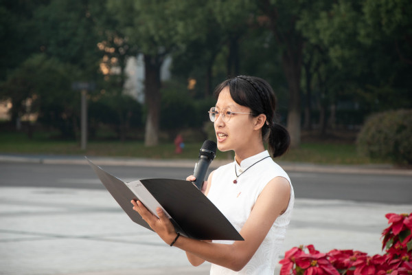 随后,顾家臻、吴佩轩、赵冉、穆泽雯四名同学进行了诗朗诵《大写的中国》。他们的声音仿佛穿越时空,带领全体师生重新回顾了中国几千年来灿烂而光辉的历史,看到了那美丽而壮观的山河,表达了当代青年满腔的爱国之情。