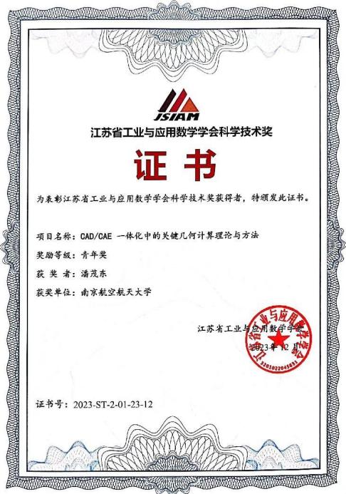 12月23-24日,江苏省工业与应用数学学会2023年学术年会在南京理工大学召开,会上颁发了第六届江苏省工业与应用数学学会科学技术奖。21点 潘茂东老师申报的“CAD/CAE 一体化中的关键几何计算理论与方法”项目荣获江苏省工业与应用数学学会科学技术奖-青年奖,并做了题为“面向CAD/CAE一体化的关键几何计算理论”大会特邀报告。