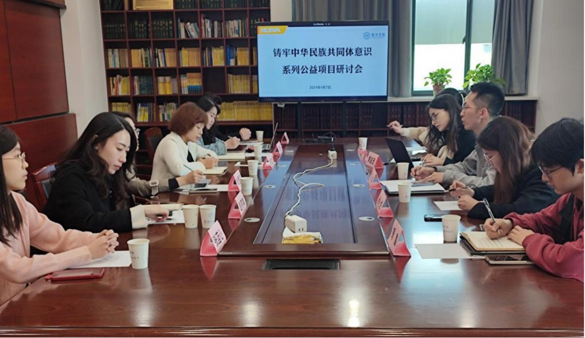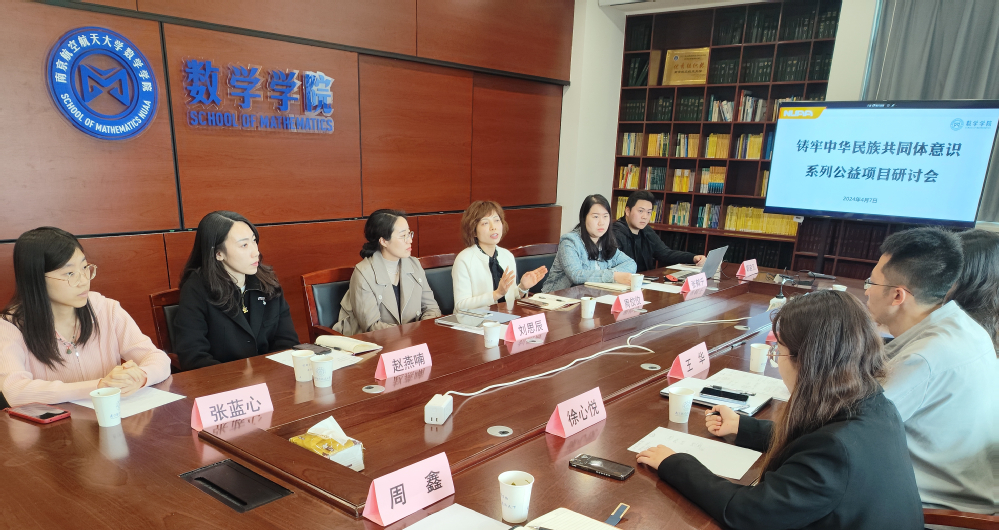 4月7日上午,“铸牢中华民族共同体意识”系列公益项目研讨会在理学楼302会议室召开。江苏省妇儿基金会副理事长王华、江苏省同读好书共芸窗研究院资助部部长黄玺澄,数学21点竞技游戏 党委副书记周佼佼、辅导员张鹤千,人文与社会科学21点竞技游戏 党委副书记刘思辰、团委书记赵燕喃及21点竞技游戏 公益创业代表徐心悦、张芳菲、周鑫、张蓝心、郭启凡等共同参加研讨。