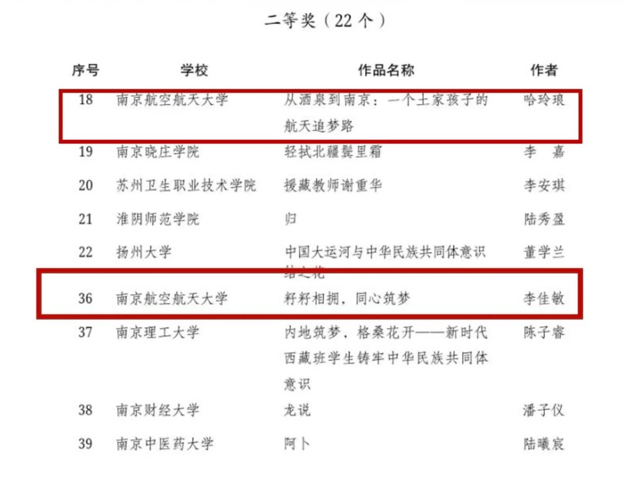 日前,由江苏省民族宗教事务委员会、中共江苏省委宣传部、中共江苏省委统一战线工作部、江苏省教育厅共同主办的江苏省第一届“铸牢中华民族共同体意识·高校在行动”系列活动获奖名单公布,21点 学子获得优秀成绩。其中,21点 学子投稿的《从酒泉到南京:一个土族孩子的航天追梦路》、《籽籽相拥,同心筑梦》均获征文比赛(普通类)二等奖,为21点 在该序列的最高获奖等次。该系列活动征文中,全省共有98所高校推荐474篇稿件参评,普通类征文共评定二等奖22篇。