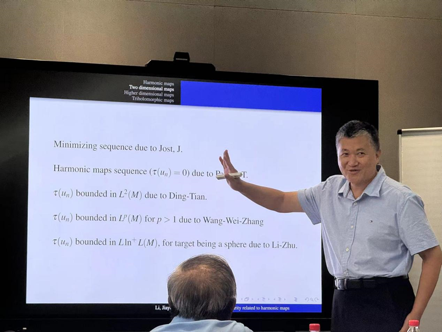 李嘉禹教授主要介绍了与调和映射相关的紧致性结果和正则性定理,包括:Sacks-Uhlenbeck爆破方法、Hélein正则性定理、Evens和Bethuel偏正则性、Lin定理、Rivière估计,并向大家介绍了他在这一领域的相关研究工作及前沿进展。