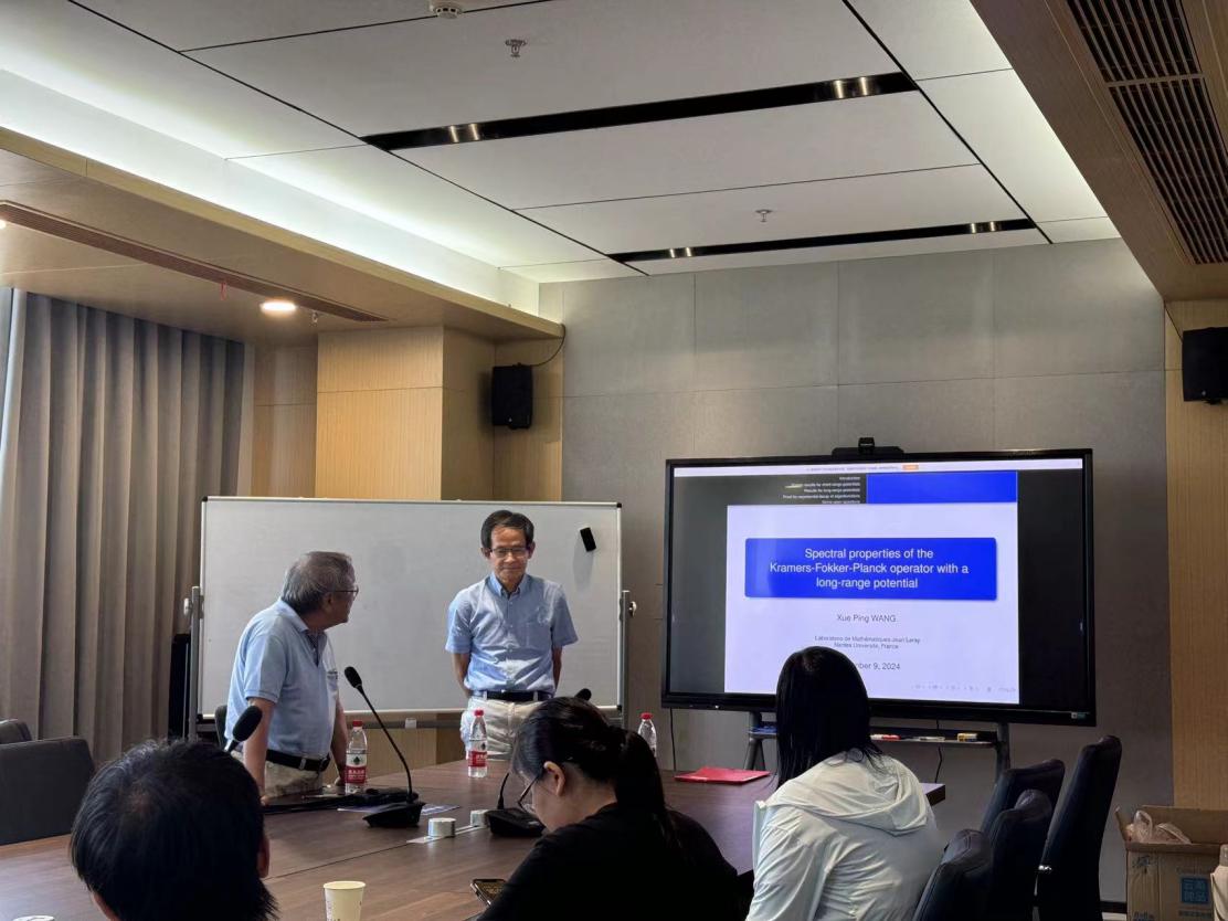 王教授主要介绍了具有长程势的Kramers-Fokker-Planck算子的实共振和嵌入特征值的内容,并向大家介绍了他在这一领域的相关研究工作及前沿进展。