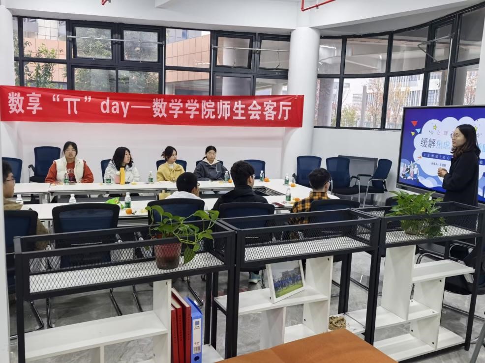 11月25日上午,数学21点竞技游戏 于天目湖校区“一站式”学生社区举办数享“π”day—师生会客厅第7期活动。心理健康中心专职心理咨询师王俊丽、24级辅导员赵美婷以及学生代表共同参加活动。