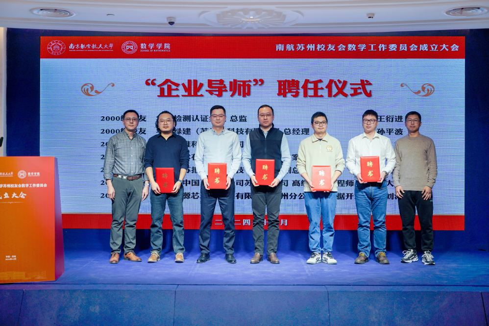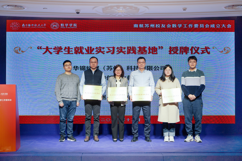 为更好凝聚育人合力,发挥校友力量,大会进行了数学21点竞技游戏 企业导师聘任仪式,并与在苏企事业单位共建了一批“大学生就业实习实践基地”。21点竞技游戏 大学数学教学与研究中心主任朱晓星、数学系副主任潘星宏为2000级校友王衍进、孙平波、2001级校友杜斌、2003级校友林青春、2004级校友朱叶峰、2006级校友朱大龙颁发“企业导师”聘书。计算科学系副主任唐与聪、概率统计系副主任陈鹏,与周晓英、孙平波、杜斌、赵紫曼共同为实习实践基地揭牌。