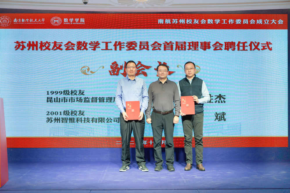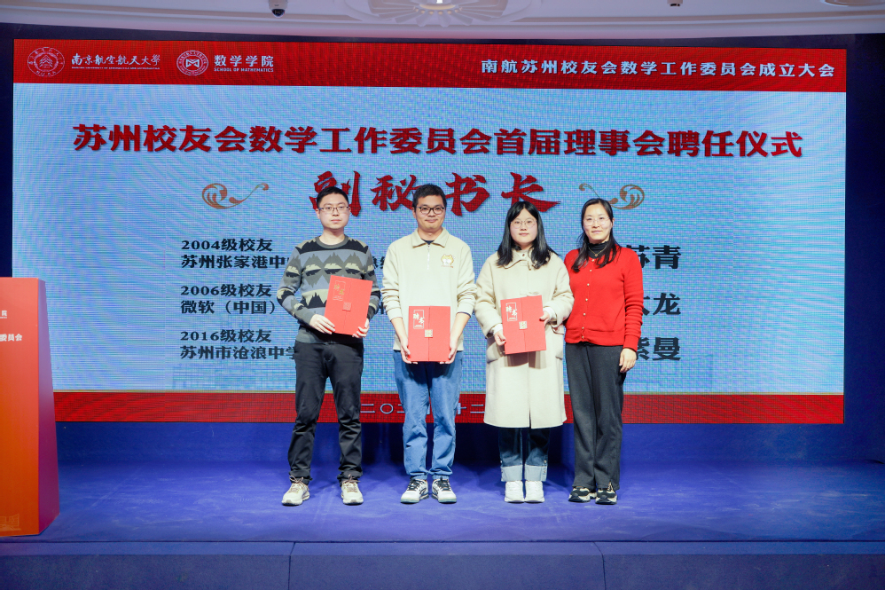 许静为数学专业2000级校友、苏州中创铝业有限公司总经理周晓英颁发会长聘书,王春武为1999级校友、昆山市市场监督管理局千灯分局副局长郁胜杰,2001级校友、苏州智惟科技有限公司CEO杜斌颁发副会长聘书,龚跃政为2000级校友、相城区退役军人事务局副局长谢景超颁发秘书长聘书,院长助理吴健为2004级校友、中山证券有限责任公司唐苏青,2006级校友、微软(中国)有限公司苏州分公司高级软件工程师朱大龙,2016级校友、苏州市沧浪中21点竞技游戏 教师赵紫曼颁发副秘书长聘书。