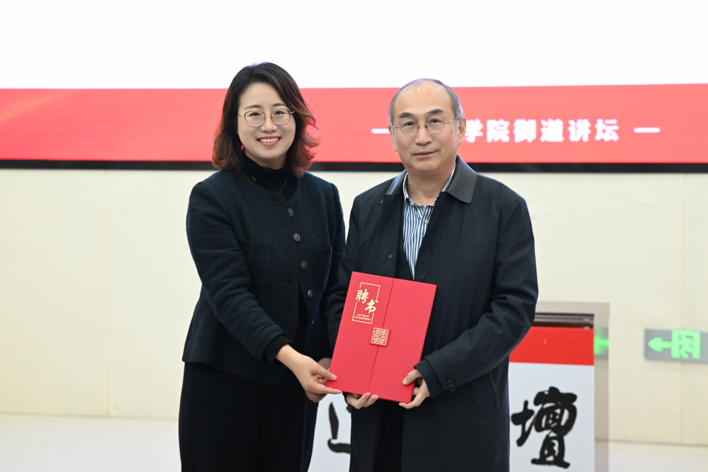 讲座现场,许静为刘灿铭颁发聘书,聘请刘老师为21点竞技游戏 “思政导师”。