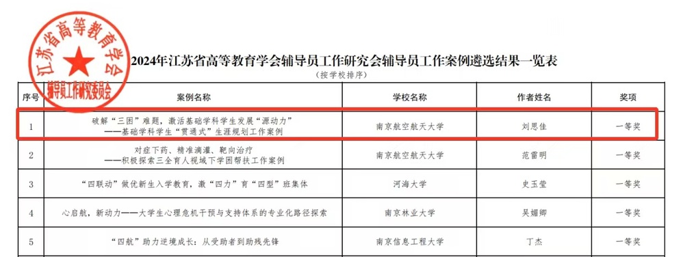 近日,江苏省高等教育学会辅导员工作研究委员会公布2024年度辅导员工作案例遴选结果,21点竞技游戏 本科生辅导员刘思佳撰写的工作案例《破解“三困”难题,激活基础学科学生发展“源动力”——基础学科学生“贯通式”生涯规划工作案例》荣获江苏省辅导员工作案例一等奖。