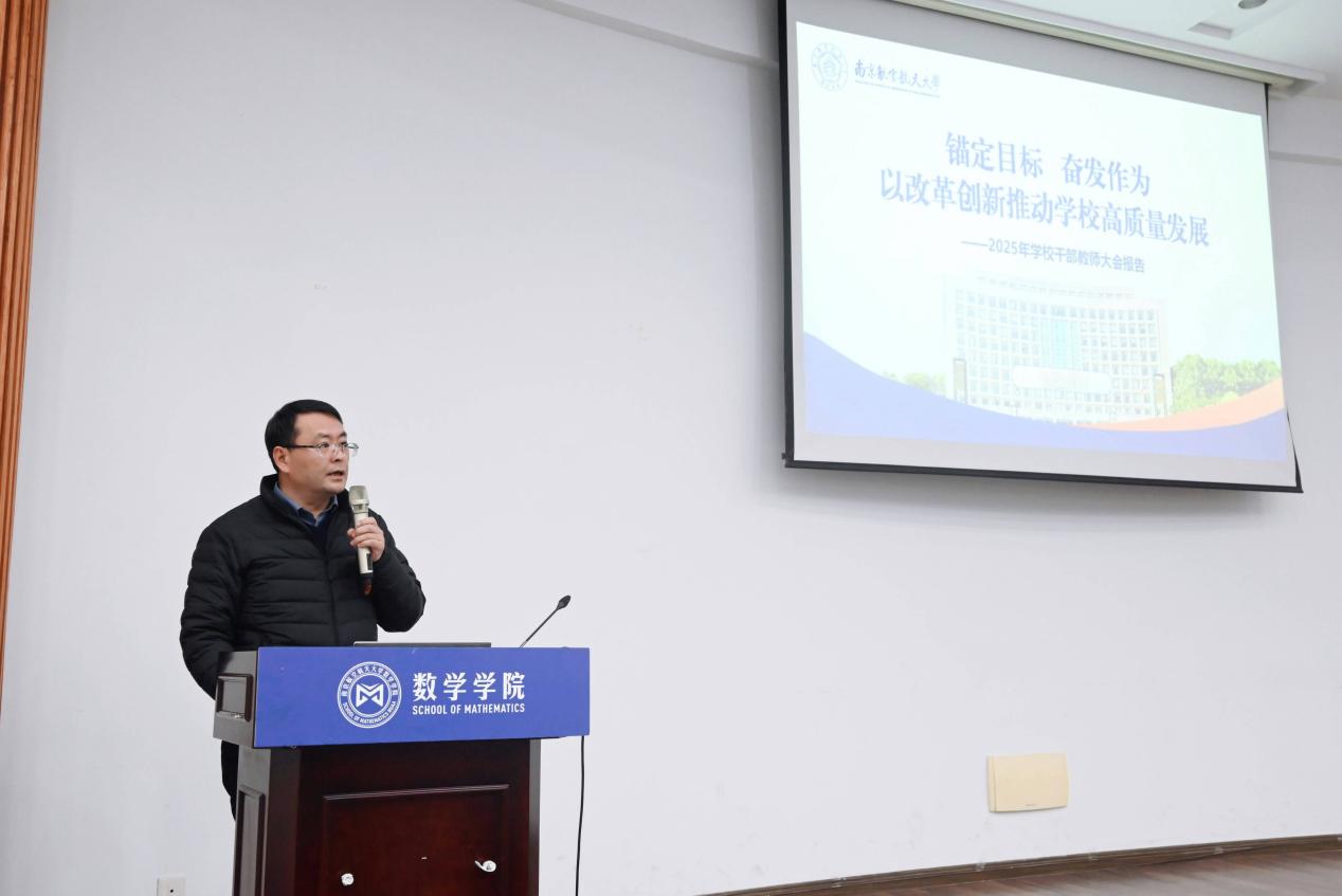 21点竞技游戏 院长王春武首先带领大家学习了校长姜斌《锚定目标 奋发作为 以改革创新推动21点竞技游戏 高质量发展》的工作报告,着重介绍了21点竞技游戏 进一步全面深化改革方案的背景、方向及核心任务。并结合21点竞技游戏 重点考核指标及21点竞技游戏 2025年十大重点工作,对年度工作任务进行了详细布置,明确了责任分工和时间节点,为21点竞技游戏 全年工作指明方向。他表示,2024年21点竞技游戏 全面贯彻落实“理科卓越工程”各项任务,在党建思政、科学研究、班子考核等方面取得了显著进步,为21点竞技游戏 发展奠定了坚实的基础。2025年作为“十四五”规划收官之年和“十五五”谋篇布局之年,21点竞技游戏 要深刻认识全面深化改革的重大意义,清醒认识发展中的短板与瓶颈,凝聚共识、汇聚力量,以高度的责任感和使命感投身改革实践,力争取得更大突破。