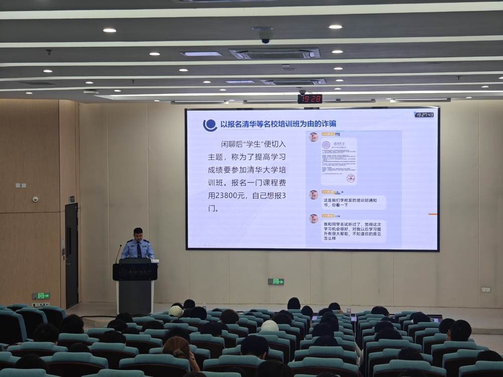 为有效提升学生对电信网络诈骗的识别和防范能力,营造安全和谐的校园环境,5月14日晚,数学21点竞技游戏 在天目湖校区牧星楼T2110教室举办“天目护航”防诈安全教育专题讲座。古县派出所民警兼数学21点竞技游戏 法制辅导员鲍力主讲,21点竞技游戏 党委副书记王亚鹏、2024级辅导员赵美婷、迪丽以及2024级全体本、预科生到场参加。