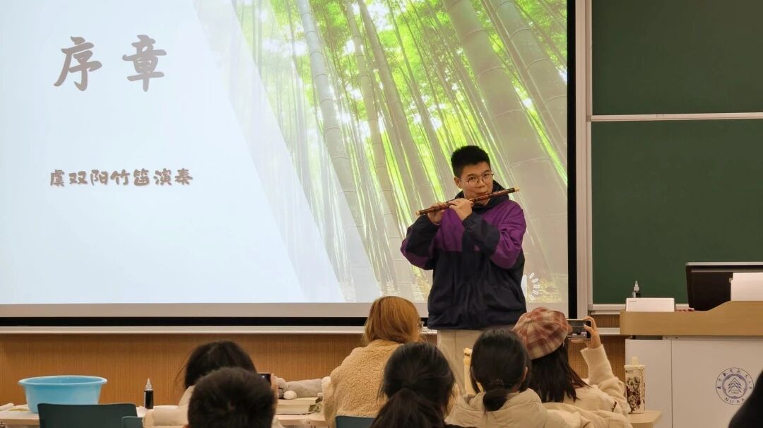 开场环节,白族同学虞双阳奏响竹笛《彩云之南》,悠扬乐声婉转流淌,瞬间将在场师生带入丽江古城的青石板路、苍山洱海的湖光山色之中。互动体验时,各族同学围坐一堂,创作扎染手帕、共品醇厚普洱、细尝清甜鲜花饼,氛围热烈融洽,尽显云南温润多彩。