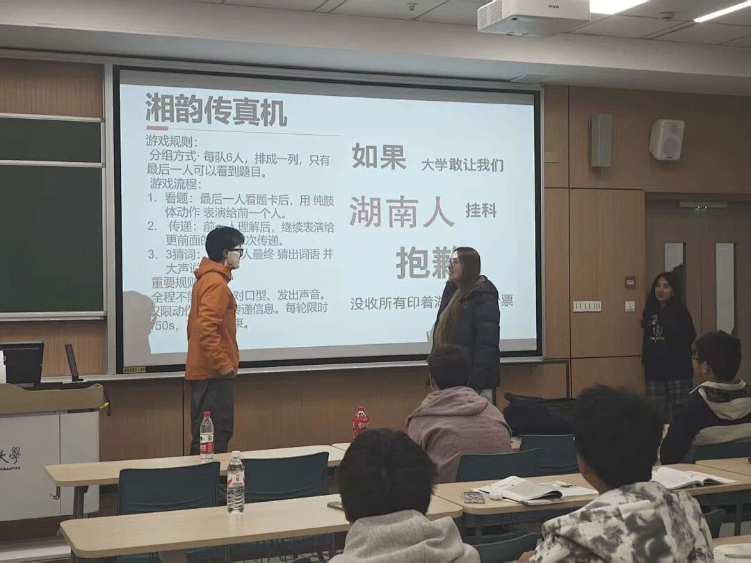 趣味互动环节成为本次活动的一大亮点。“湘韵传真机”游戏中,各族同学分组协作,仅凭肢体动作传递“剁椒鱼头”等湖湘美食词条,现场笑声不断;以湖南特色元素为线索,在推理互动中加深大家对湖湘文化的认知;“抓鸭子”趣味游戏更是点燃全场热情,同学们在轻松愉悦的氛围中感受湖南民俗的鲜活趣味。