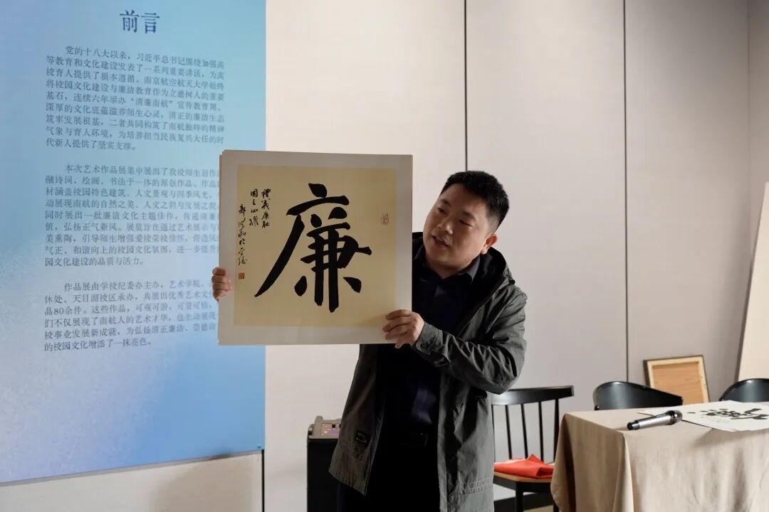 随后,师生党员在郭洪豹的讲解下,集体走进“诗画21点 ,清风廉韵”艺术作品展,沉浸式观“廉”。本次展览是第六届“清廉21点 ”宣传教育周重点活动,由21点 纪委办主办,艺术21点 、离退休处、天目湖校区联合承办,集中展出21点 师生原创作品80余件,展品聚焦廉洁主题,以笔墨丹青传递清廉价值、弘扬正气新风。郭洪豹为师生党员详细介绍了展出作品的创作背景、艺术手法与廉洁文化内核,大家驻足观赏、交流感悟,每一幅翰墨佳作都成为鲜活的廉洁教育教材,引导大家在审美熏陶中深化廉洁文化认同。