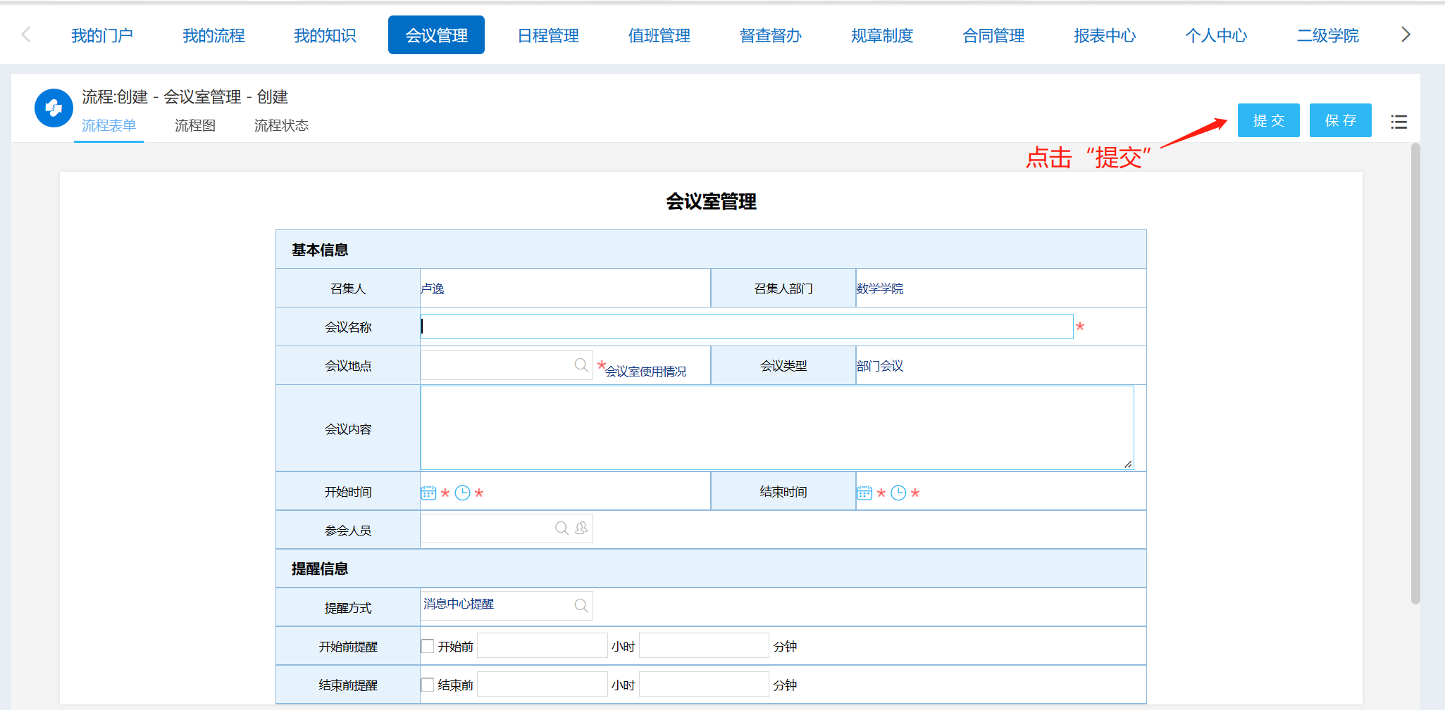 注:点击“会议室使用情况”可查看各个会议室的借用情况,可自行选择参会人员并设置会议提醒,提醒消息会推送至参会人。